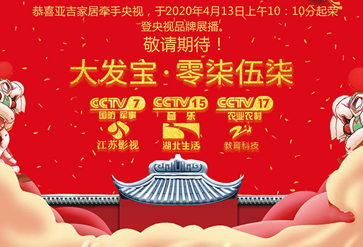 接下來,經過央視重重嚴格的審核下,大發(fā)寶(亞吉家居)從企業(yè)經營資質到產品資質全部符合國家相關嚴格規(guī)定的標準,最終在4月份強勢登陸CCTV-7、CCTV-15、CCTV-17頻道播出!同時在江蘇影視、湖北生活、浙江教育等地方頻道一同播放!
